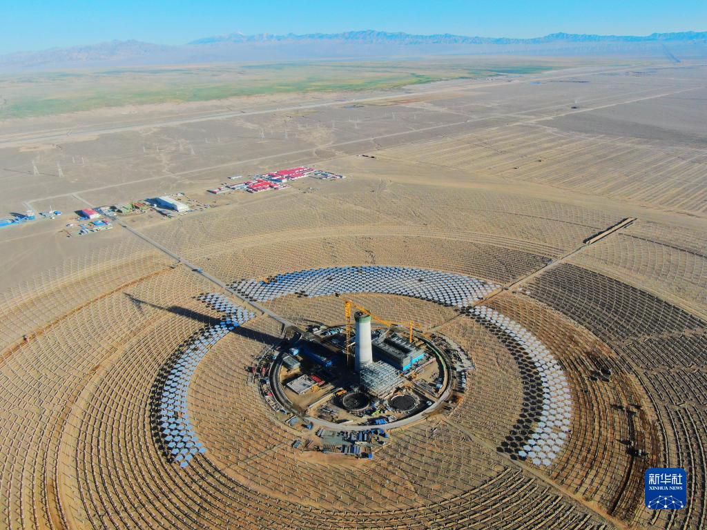 7月21日在阿克塞千萬(wàn)千瓦級可再生能源多能互補基地拍攝的匯東新能源75萬(wàn)千瓦光熱+項目建設現場(chǎng)(無(wú)人機照片)。