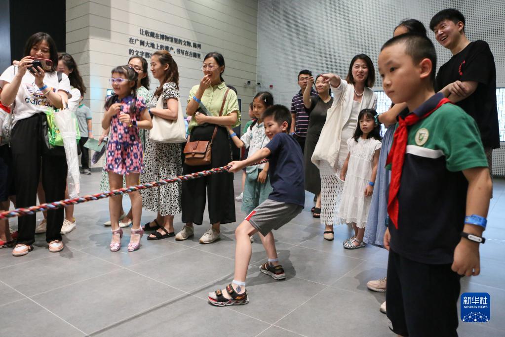 7月21日晚,小朋友在夜間“那達慕”大會(huì )上體驗拔河。