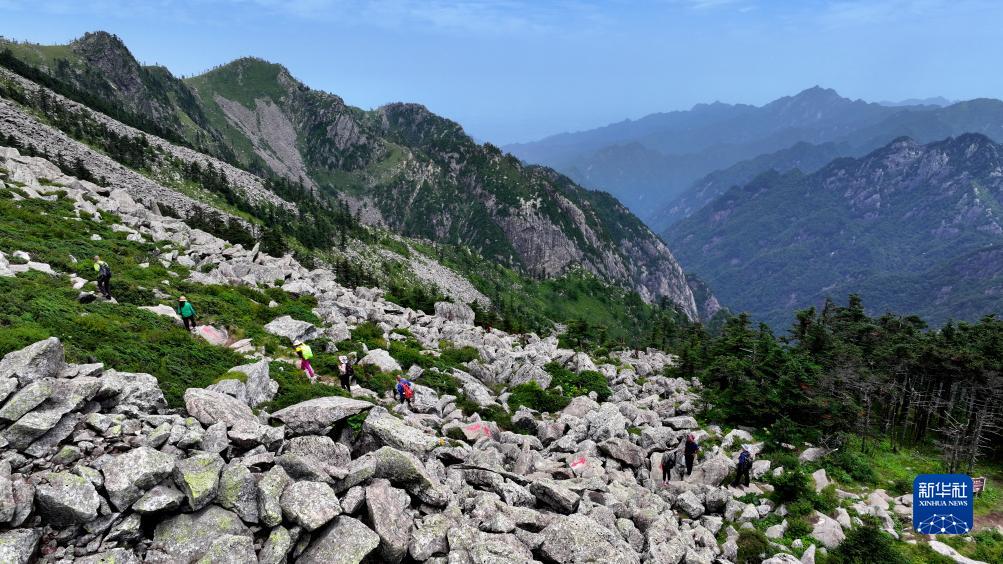 陜西朱雀國家森林公園內,游人在向峰頂攀爬(7月21日攝,無(wú)人機照片)。
