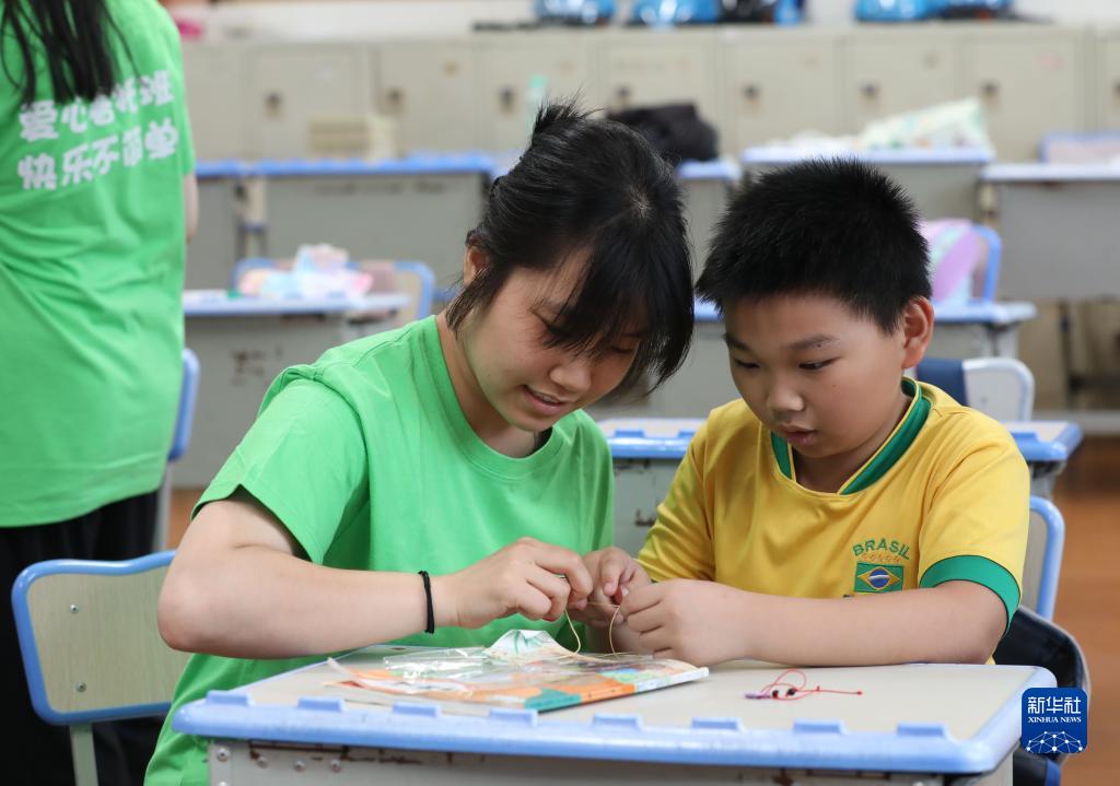 7月21日,在萬(wàn)里城實(shí)驗學(xué)校,小學(xué)生愛(ài)心暑托班“新業(yè)態(tài)新就業(yè)群體子女專(zhuān)班”的孩子們在志愿者的指導下學(xué)習編繩。