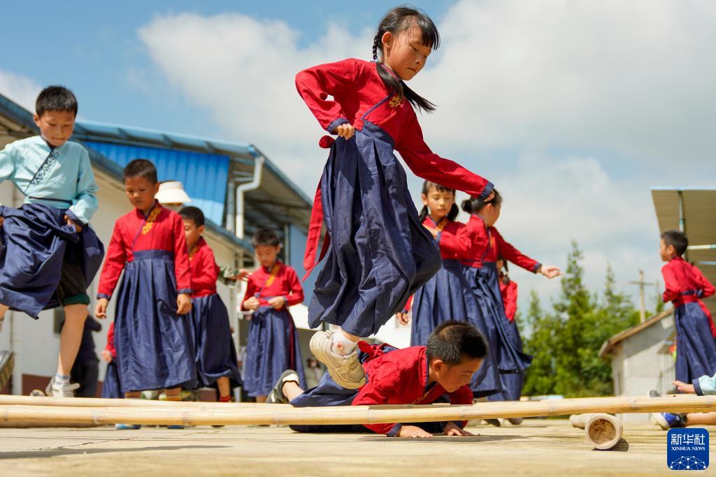 7月22日,萬(wàn)州區恒合土家族鄉一個(gè)研學(xué)基地內,參加暑期避暑研學(xué)活動(dòng)的學(xué)生在練習傳統體育運動(dòng)跳竹竿。