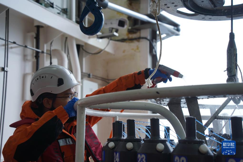 7月22日,中國第13次北冰洋科學(xué)考察隊進(jìn)行大洋作業(yè)演練,CTD(溫鹽深多參數海洋觀(guān)測系統)采集海水樣品完畢,隊員用淡水對其進(jìn)行清潔。