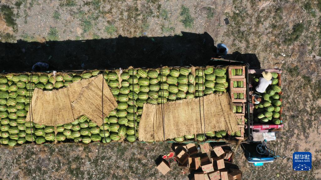 農戶(hù)在中衛市沙坡頭區香山鄉將硒砂瓜裝車(chē)運往湖北(無(wú)人機照片,7月21日攝)。