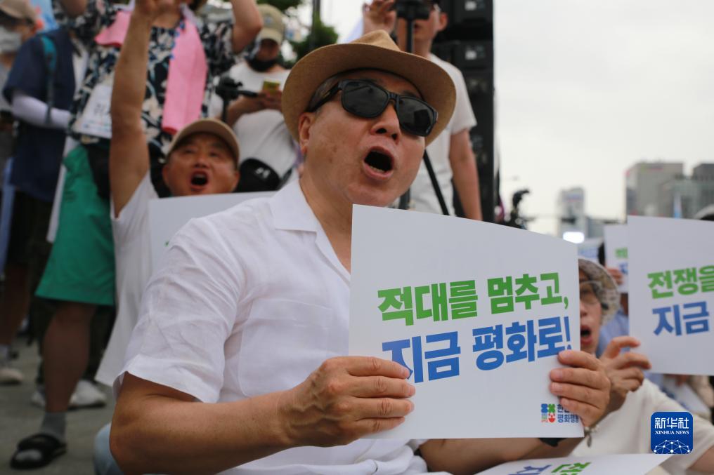 7月22日,在韓國首爾,人們手舉標語(yǔ)參與反戰游行。