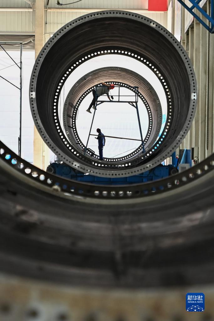在新疆塔城重點(diǎn)開(kāi)發(fā)開(kāi)放試驗區先行發(fā)展區中國水利水電第四工程局有限公司塔城分公司,工人在制造車(chē)間忙碌(7月22日攝)。