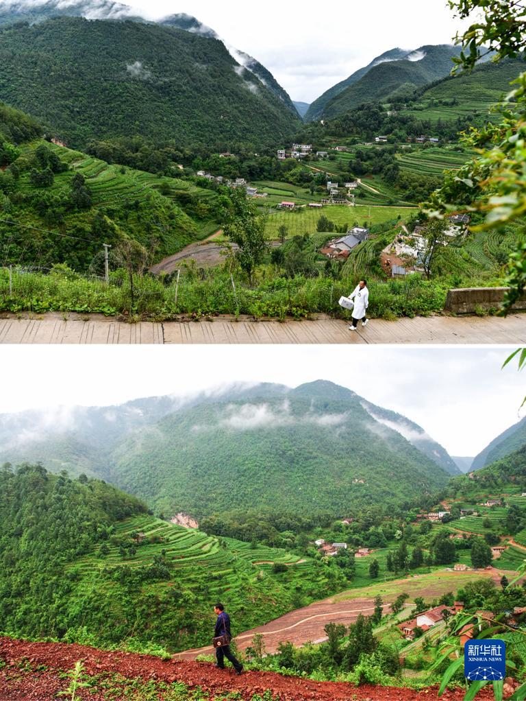 這是一張拼版照片,上圖為:2023年7月19日,朱大清出診時(shí)走在寬敞的水泥路上;下圖為:2012年7月5日,朱大清出診時(shí)走在未硬化的公路上。