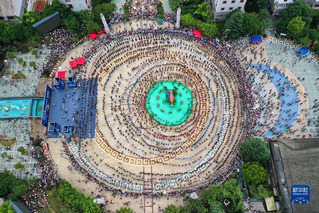 7月23日,人們在貴州劍河仰阿莎文化節上跳苗族水鼓舞(無(wú)人機拍攝)。