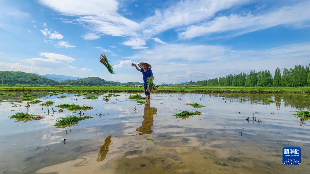 7月23日,在湖南省常寧市三角塘鎮長(cháng)江村,村民在拋丟晚稻秧苗,準備蒔插。