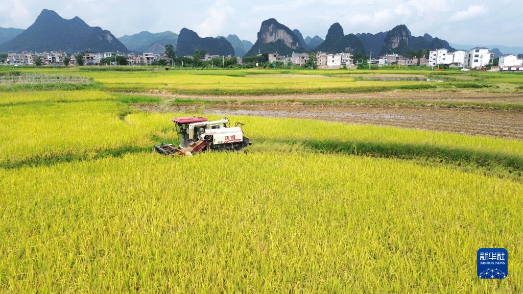 7月23日,在廣西賀州市平桂區鵝塘鎮鵝塘村,農機手駕駛收割機收割早稻(無(wú)人機照片)。