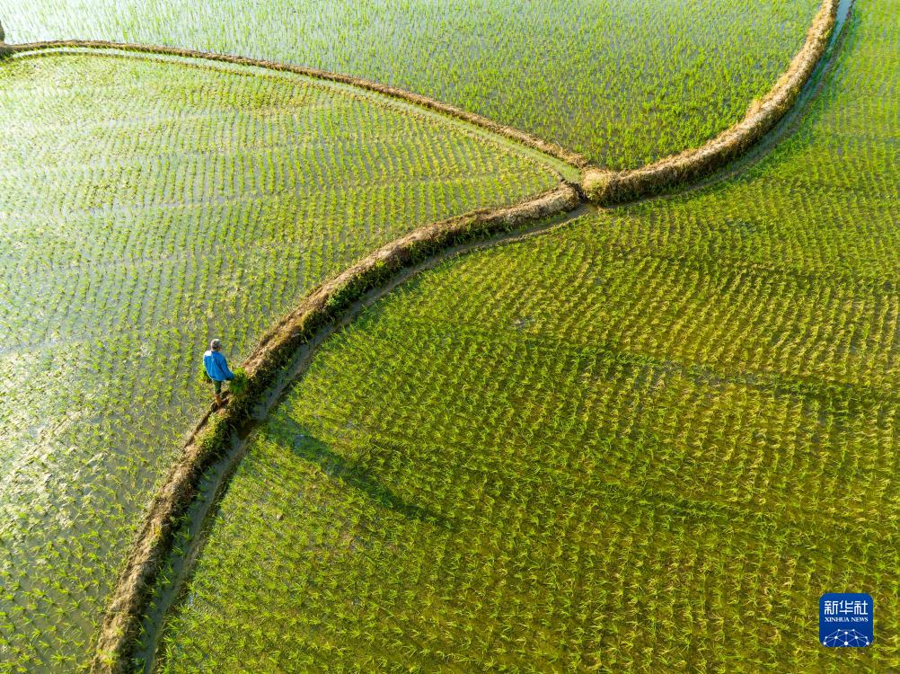 7月23日,在湖南省永州市道縣蚣壩鎮長(cháng)江圩村,農民提著(zhù)秧苗走在田埂上(無(wú)人機照片)。