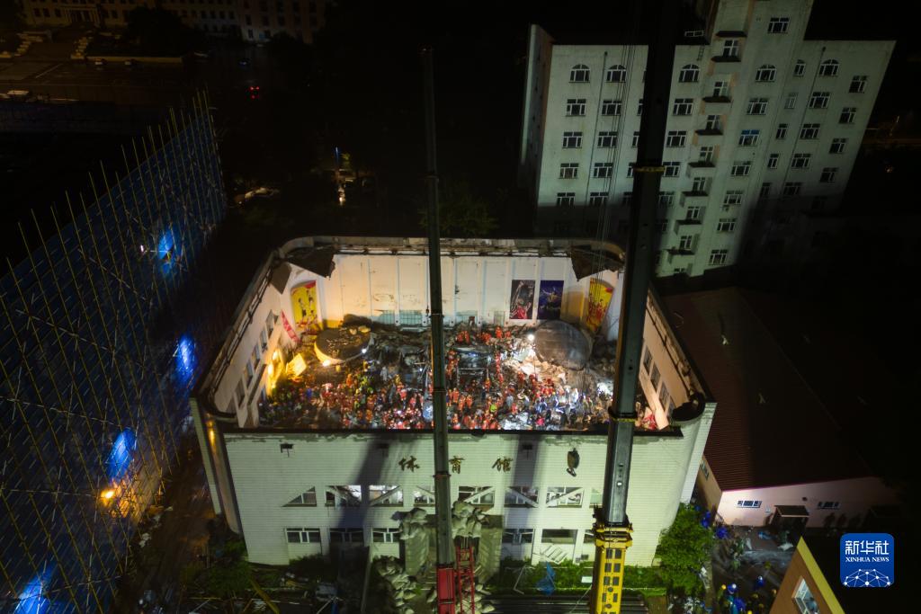 這是7月24日拍攝的齊齊哈爾市第34中學(xué)體育館樓頂坍塌事故搜救現場(chǎng)(無(wú)人機照片)。
