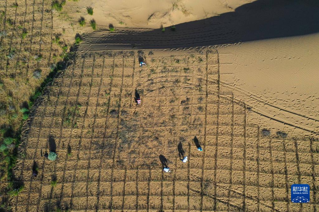 7月22日,工人在杭錦旗境內的S215線(xiàn)道路兩旁扎制草方格沙障(無(wú)人機照片)。