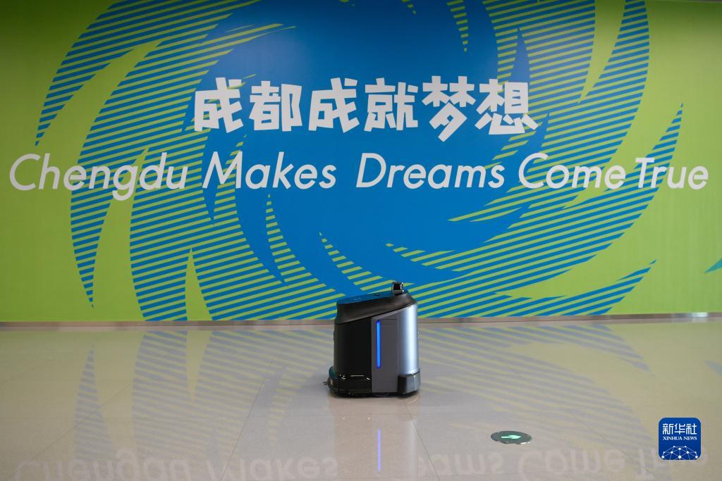 這是7月14日在大運會(huì )主媒體中心拍攝的掃地機器人。