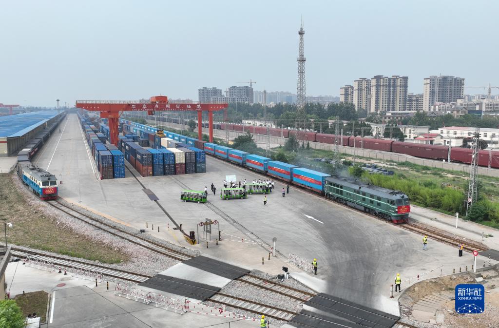 7月24日,“燕趙號”中越班列(右)從河北省石家莊國際陸港駛出(無(wú)人機照片)。