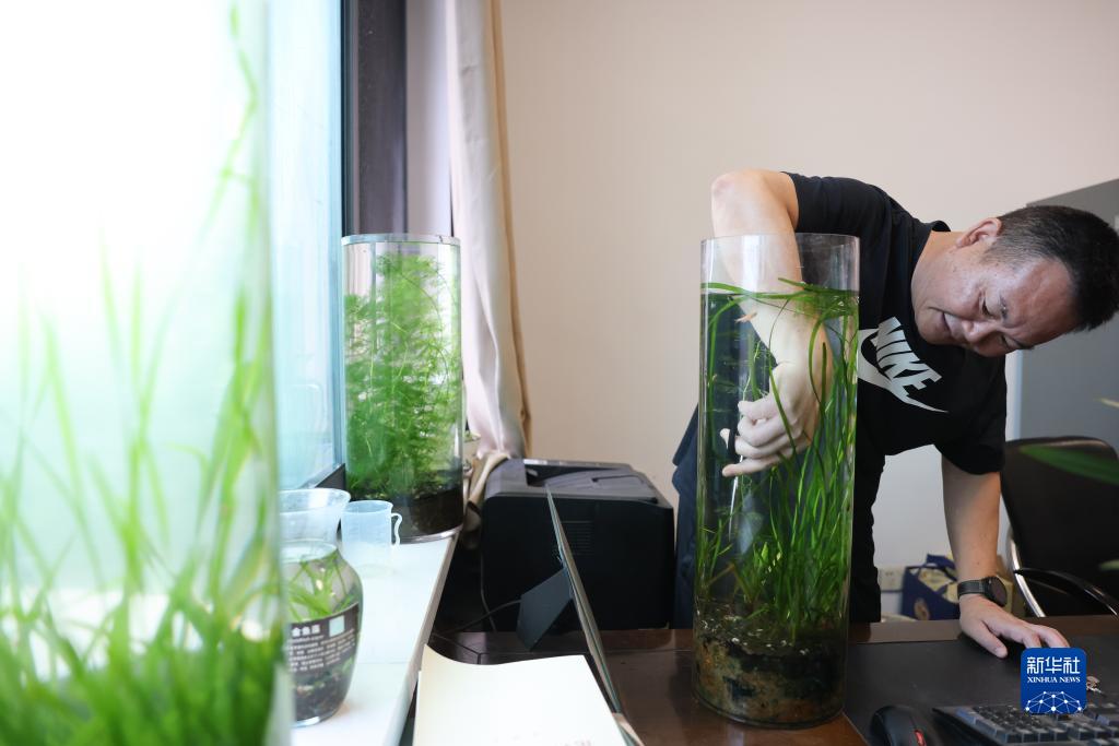 7月8日,謝永宏在位于湖南省長(cháng)沙市的中國科學(xué)院亞熱帶農業(yè)生態(tài)研究所的辦公室內修剪種養的沉水植物。新華社記者 金立旺 攝