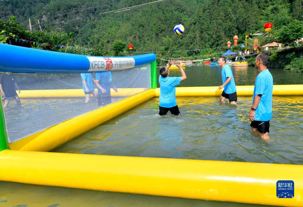 7月24日,在湖北省宣恩縣高羅鎮板寮村,村民參加“水上排球”比賽。