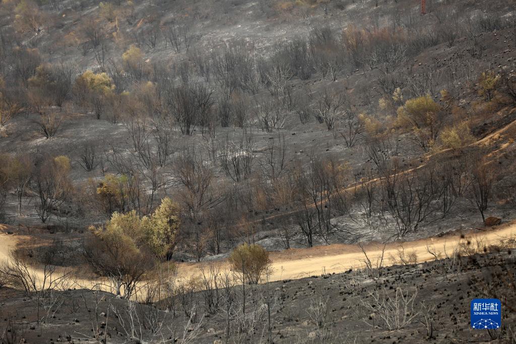這是7月24日在阿爾及利亞布維拉省拍攝的野火燒過(guò)的山坡。
