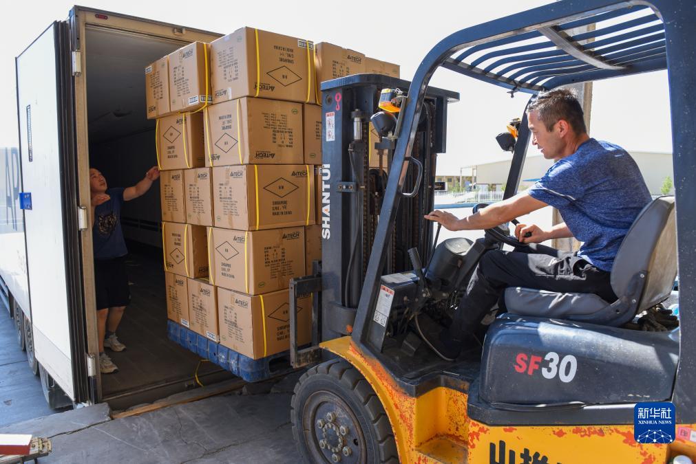 在新疆阿拉山口綜合保稅區內的跨境電子商務(wù)分揀清關(guān)中心,工作人員將貨物裝車(chē)(7月24日攝)。