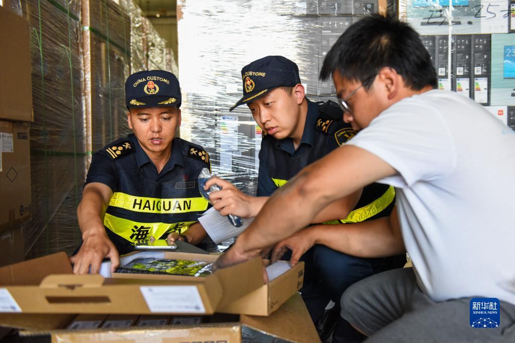 在新疆阿拉山口綜合保稅區內的跨境電子商務(wù)分揀清關(guān)中心,海關(guān)工作人員在查驗貨物(7月24日攝)。