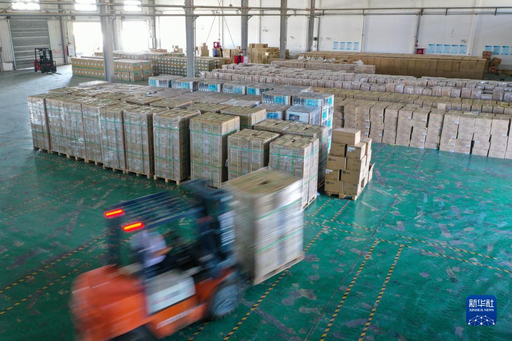 在新疆阿拉山口綜合保稅區內的跨境電子商務(wù)分揀清關(guān)中心,工作人員在監管倉庫轉運貨物(7月24日攝,無(wú)人機照片)。