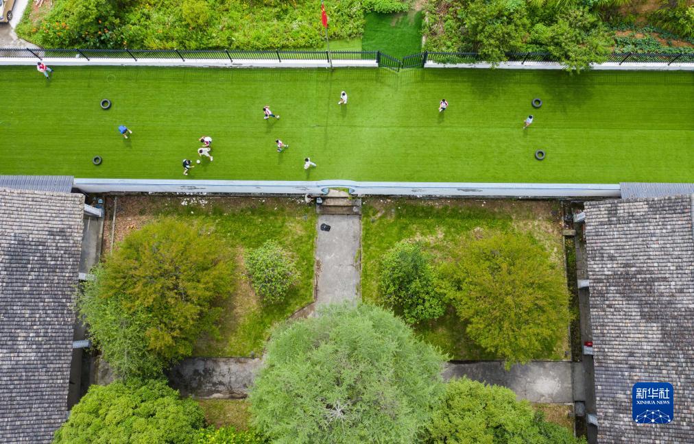 7月25日,在諸暨市馬劍鎮上和村的侯門(mén)山鄉村圖書(shū)館,暑托班的孩子們在參加體育比賽(無(wú)人機照片)。