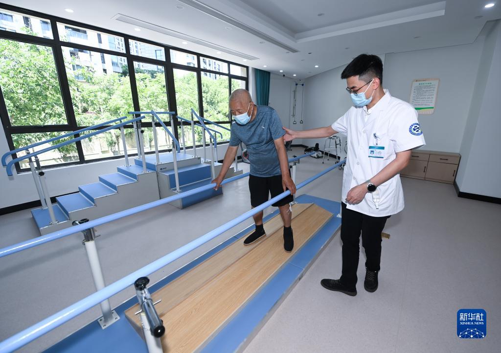 7月25日,在諸暨市浣東街道東盛社區衛生服務(wù)站的康復訓練室內,醫生在給一名患者進(jìn)行康復訓練。