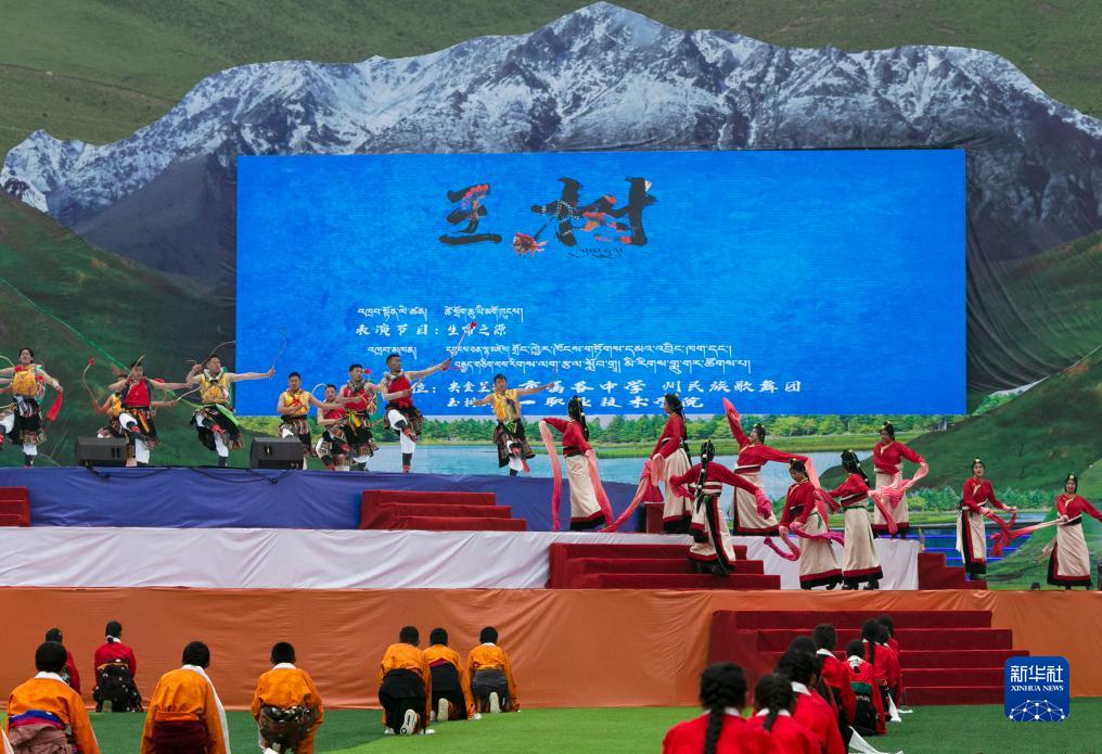 7月25日在玉樹(shù)賽馬場(chǎng)拍攝的歌舞表演。