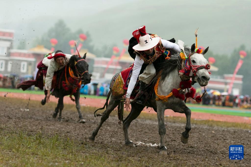 7月25日在玉樹(shù)賽馬場(chǎng)拍攝的跑馬拾哈達表演。