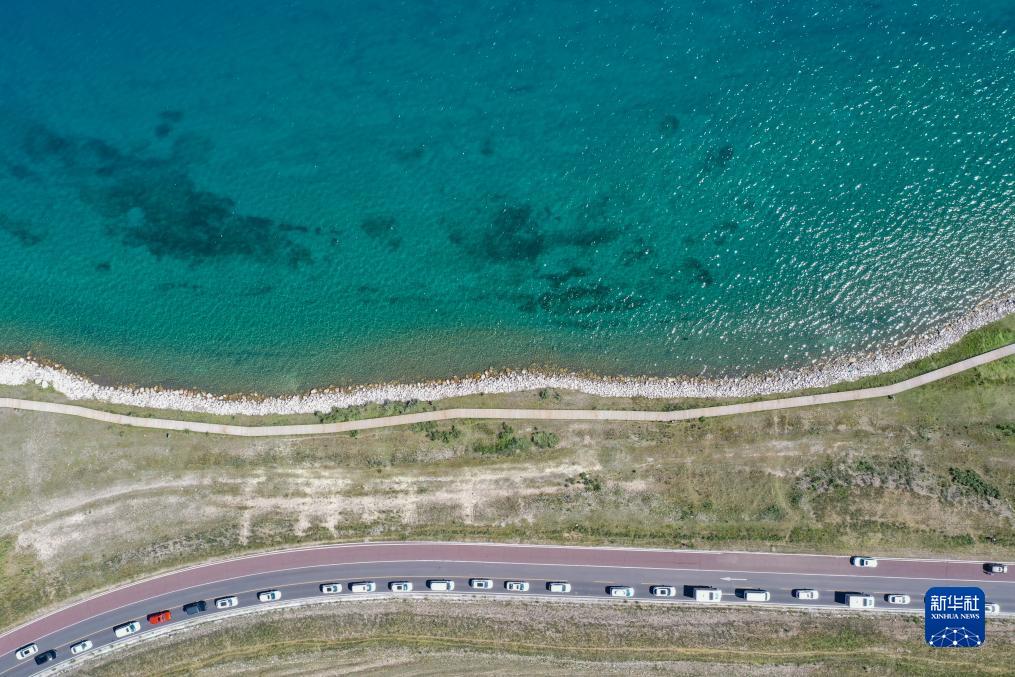 7月25日,車(chē)輛排隊進(jìn)入新疆賽里木湖景區(無(wú)人機照片)。
