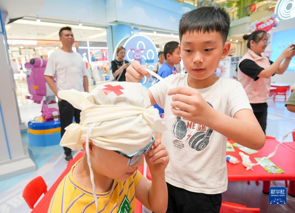 7月25日,在重慶市九龍坡區楊家坪街道一商場(chǎng)的預防溺水安全教育社區服務(wù)點(diǎn),一名小男孩在練習簡(jiǎn)易包扎技能。