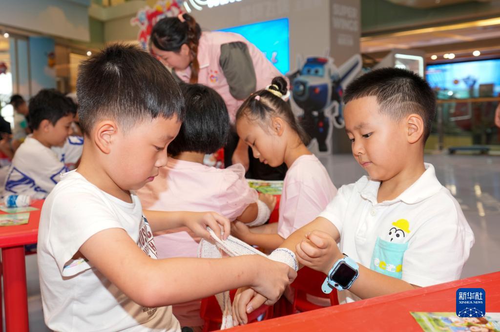 7月25日,在重慶市九龍坡區楊家坪街道一商場(chǎng)的預防溺水安全教育社區服務(wù)點(diǎn),孩子們在練習簡(jiǎn)易包扎技能。