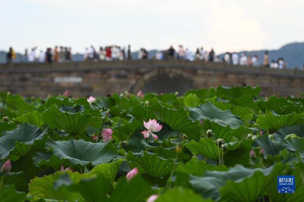時(shí)值盛夏,杭州西湖景區荷花競相綻放,呈現出“接天蓮葉無(wú)窮碧,映日荷花別樣紅”的美麗景象。