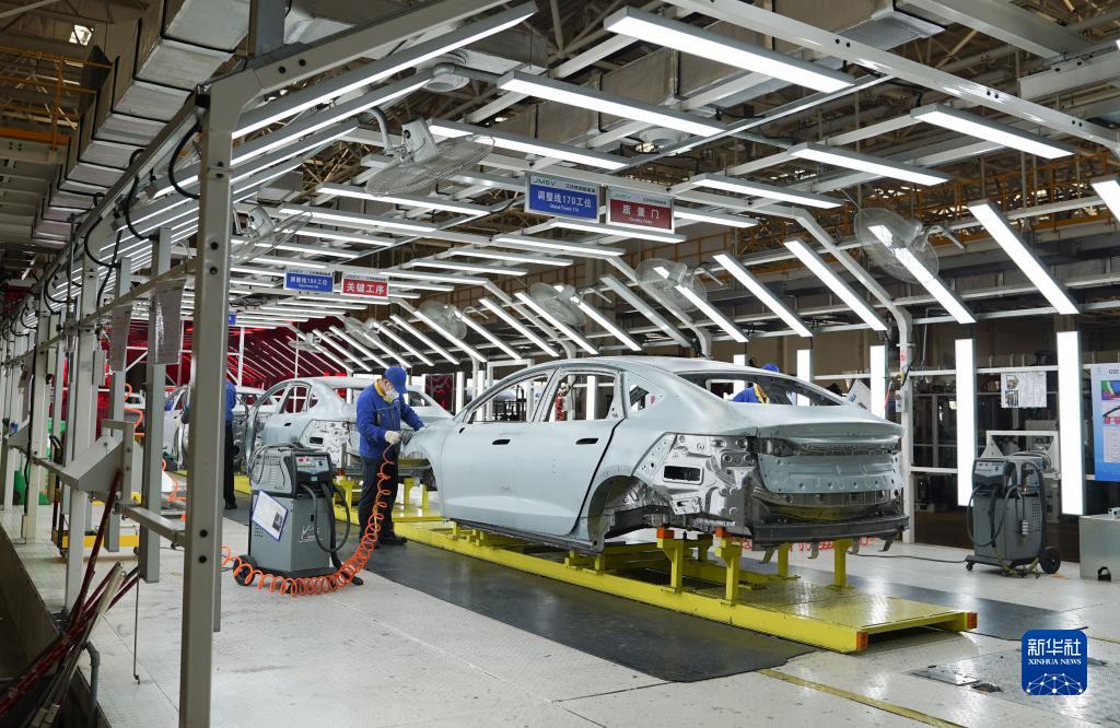 在位于江西省南昌市經(jīng)開(kāi)區的江鈴集團新能源汽車(chē)有限公司生產(chǎn)基地車(chē)間內,工人在生產(chǎn)線(xiàn)上作業(yè)(7月18日攝)。新華社記者 周密 攝