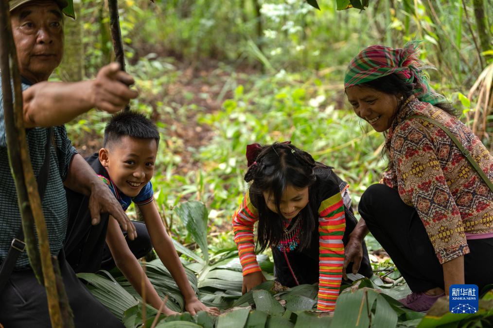 7月23日,張普忠(左一)和老伴王素英(右一)、孫子張偉軍(左二)、小孫女張麗紅一起鉆進(jìn)芭蕉葉棚子。新華社記者 費茂華 攝