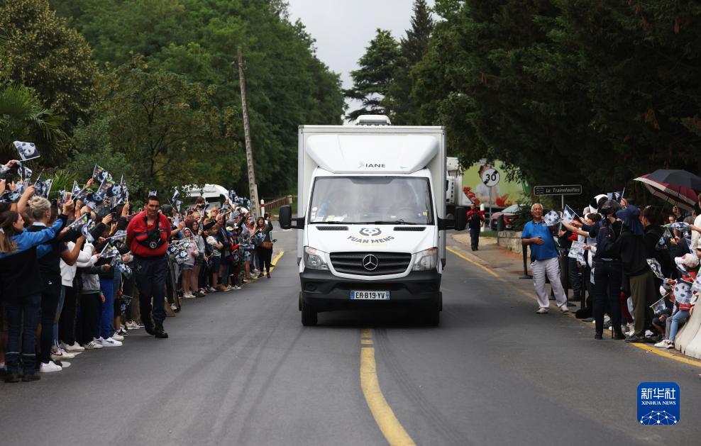 7月25日,在法國圣艾尼昂市博瓦勒野生動(dòng)物園外,人們送別搭載熊貓“圓夢(mèng)”的車(chē)離開(kāi)。