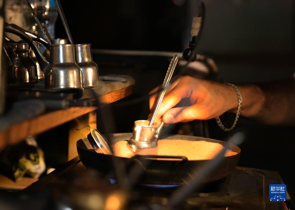 7月25日,在埃及開(kāi)羅街頭,一名男子用汽車(chē)后備箱中的設備制作咖啡。