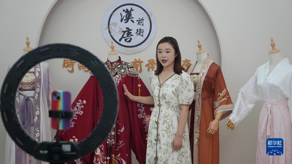7月25日,在山東曹縣一家生產(chǎn)漢服的公司內,主播正在向網(wǎng)友推介漢服產(chǎn)品。