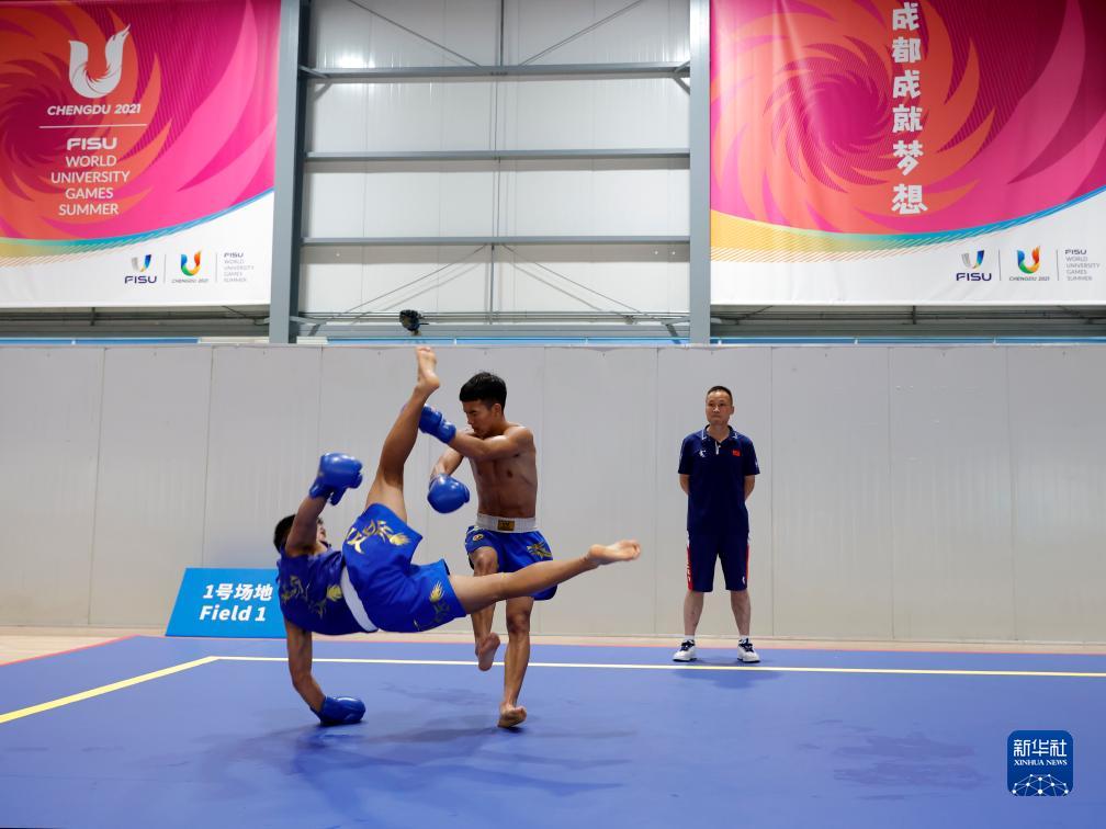 7月25日,參加第31屆世界大學(xué)生夏季運動(dòng)會(huì )武術(shù)散打比賽的中國選手在成都城北體育館訓練。