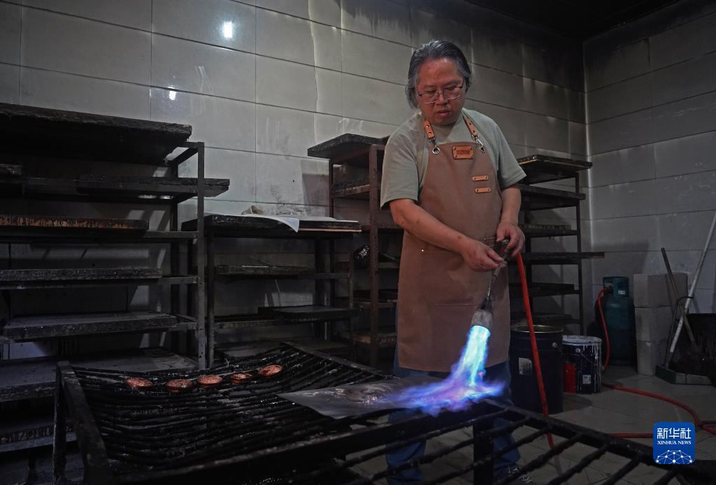 黃俊軍在將銅版畫(huà)進(jìn)行淬火(7月13日攝)。