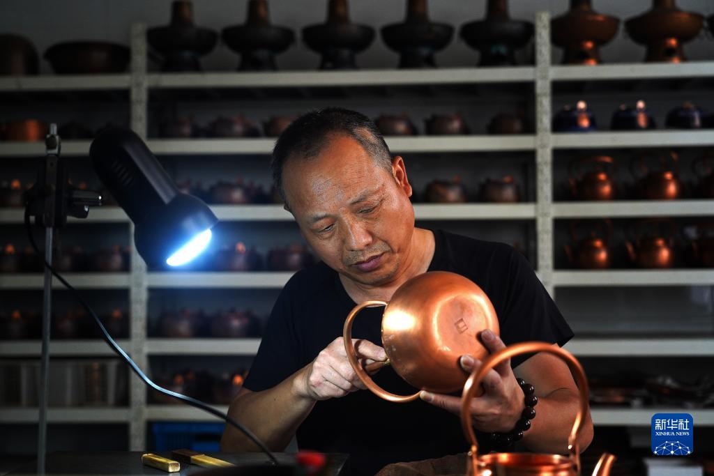 以往手工鏨刻技藝一般是師傅帶徒弟,匠人從頭到尾完成一個(gè)產(chǎn)品,費時(shí)耗力。經(jīng)過(guò)鉆研和改良,黃俊軍采用“制胚現代工業(yè)技術(shù)+傳統鏨刻工藝”的生產(chǎn)方式,讓匠人負責分段工序,提高了產(chǎn)品的生產(chǎn)效率,同時(shí)也不失手工鏨銅的品味。