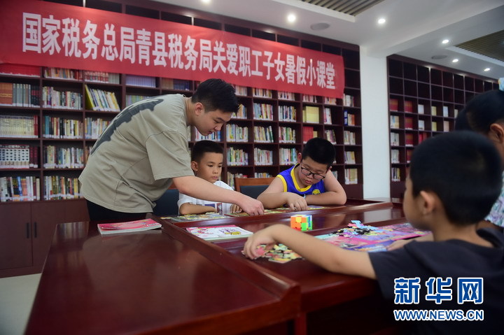 暑假期間,國家稅務(wù)總局河北青縣稅務(wù)局在機關(guān)讀書(shū)室舉辦關(guān)愛(ài)職工子女暑假小課堂,招募返鄉大學(xué)生組建小課堂志愿服務(wù)隊伍,根據孩子們的興趣活動(dòng)開(kāi)展繪畫(huà)、手工制作、安全教育、心理交流等課程。新華網(wǎng)發(fā)(張悅 攝)