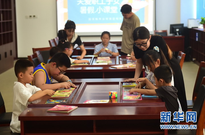 志愿者在河北青縣稅務(wù)局組織的關(guān)愛(ài)職工子女暑假小課堂上對孩子們進(jìn)行輔導。新華網(wǎng)發(fā)(張悅 攝)