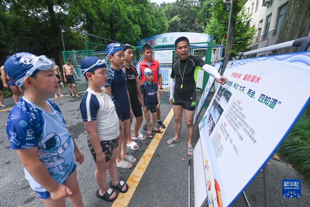 7月26日,國家中級游泳救生員、體育老師徐剛強(右一)在“蒲公英愛(ài)心習泳館”暑期愛(ài)心公益游泳班教孩子們防溺水知識。