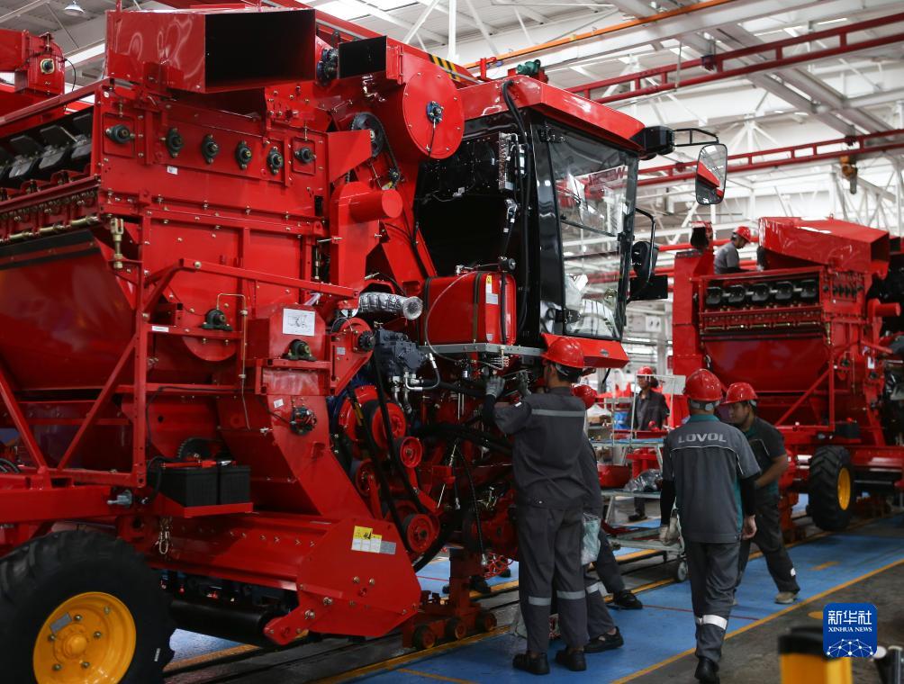 7月26日,在位于濰坊市的濰柴雷沃智慧農業(yè)科技股份有限公司,工人在車(chē)間組裝玉米收割機。
