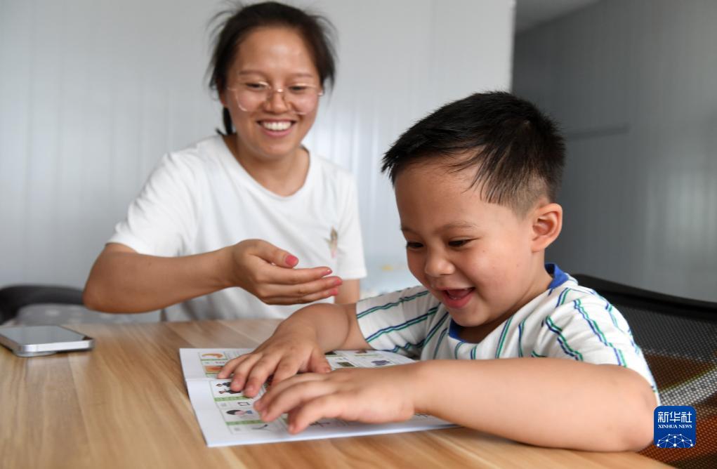 7月26日,在廣西上橫高速公路建設工地職工宿舍活動(dòng)板房里,來(lái)自廣西來(lái)賓市的韋靖楷在媽媽的指導下看圖識字。