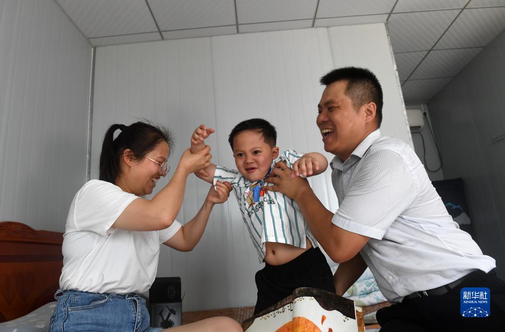 7月26日,在廣西上橫高速公路建設工地職工宿舍活動(dòng)板房里,來(lái)自廣西來(lái)賓市的韋靖楷和爸爸媽媽一起玩耍。
