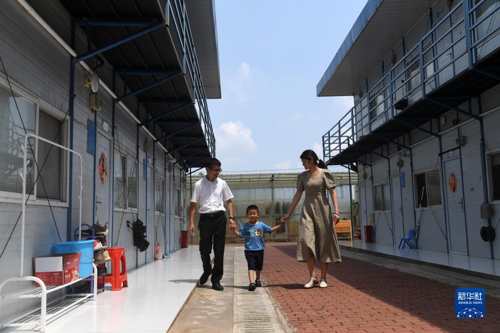 7月26日,在廣西上橫高速公路建設工地職工宿舍區,來(lái)自湖北省麻城市的劉宇燦和爸爸媽媽從活動(dòng)板房前走過(guò)。