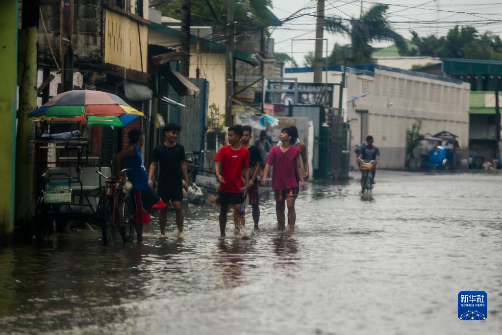 7月26日,人們在菲律賓馬拉邦一處積水的街道涉水而行。