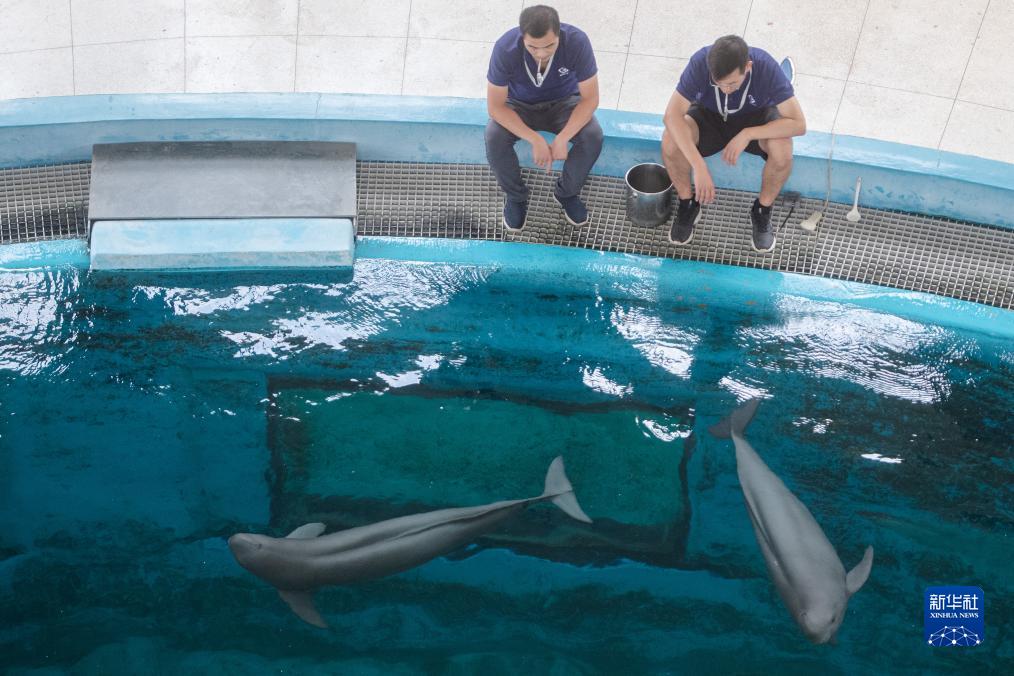 6月29日,訓練員王超群(左)、鄧正宇觀(guān)察白鱀豚館內的長(cháng)江江豚。
