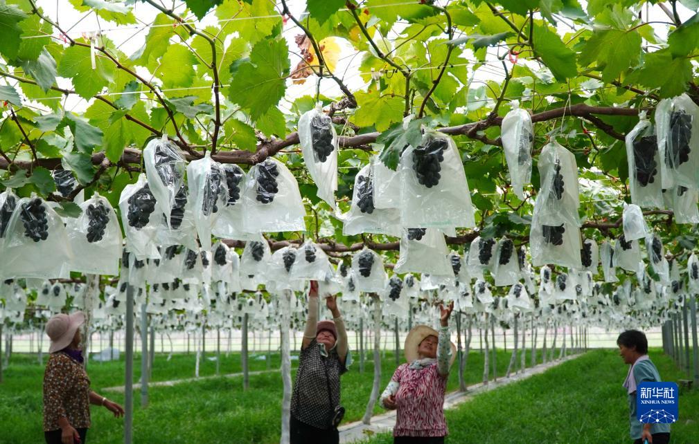 7月26日,在山東省新泰市樓德鎮,果農在高標準葡萄大棚里收獲成熟的葡萄。